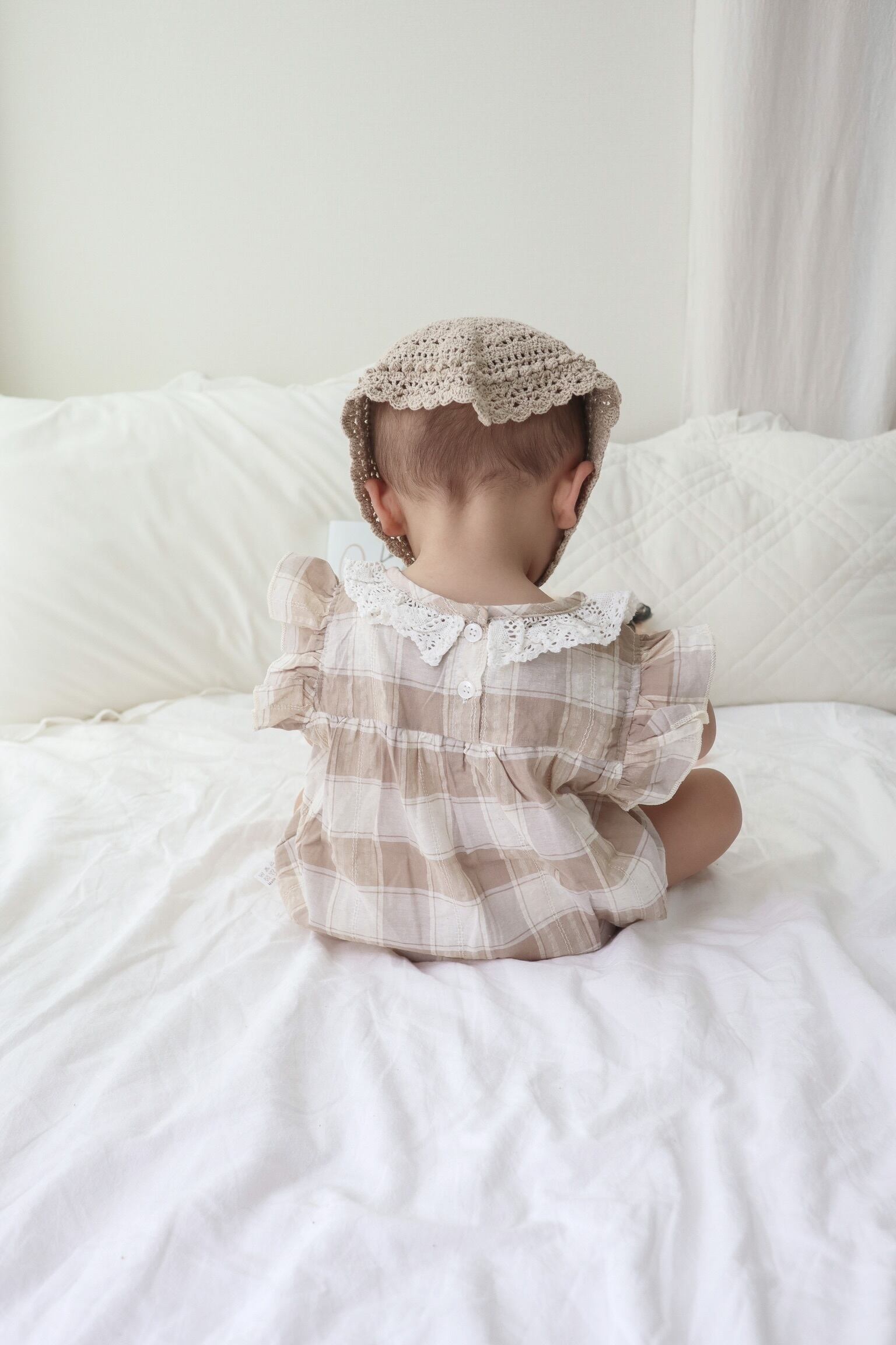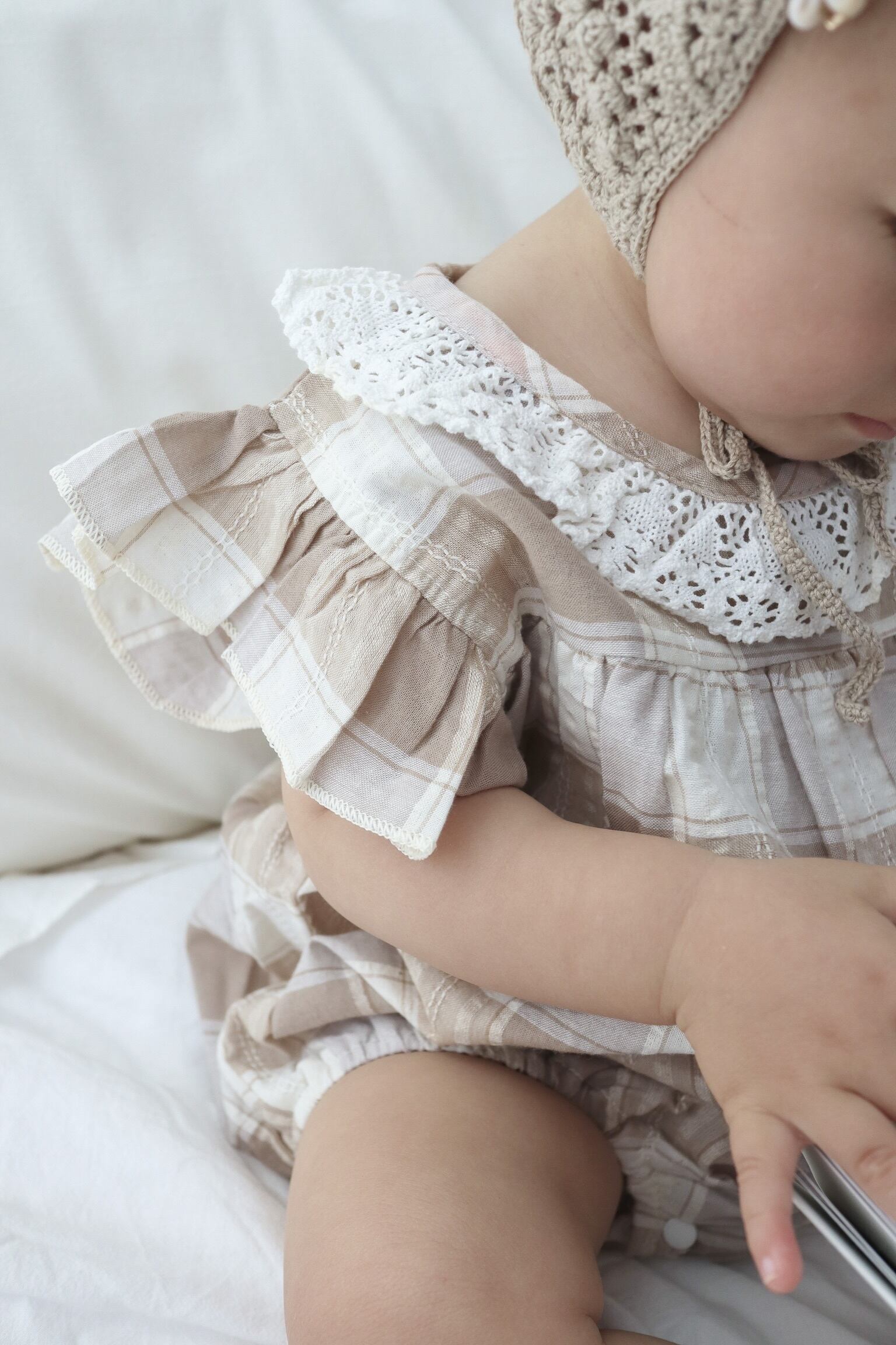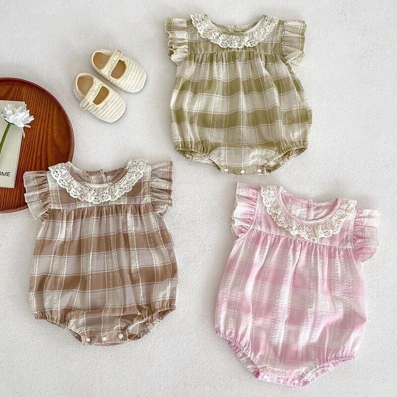 【取寄】さりげないレースとフリルが上品なチェックロンパース
