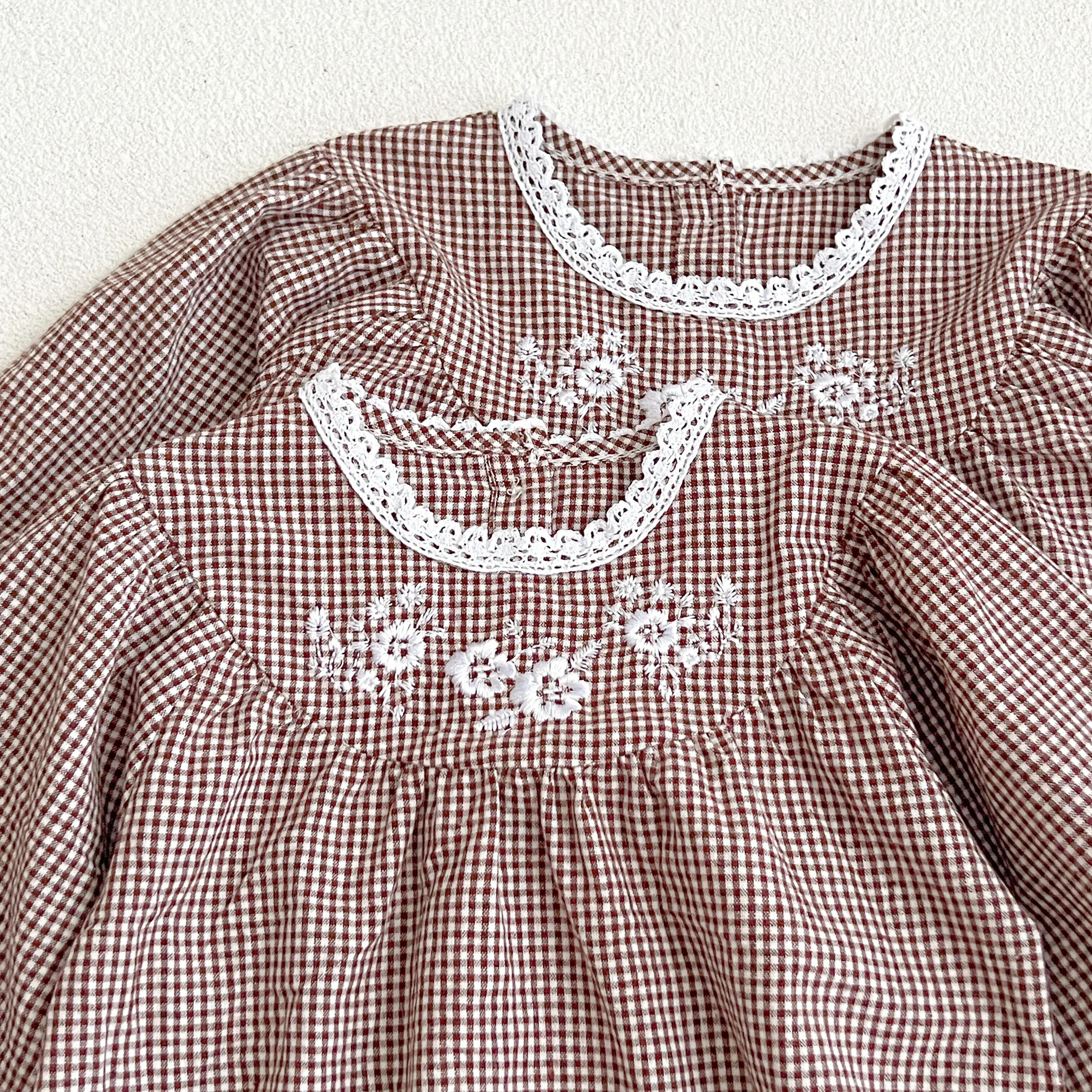【取寄】2段レースと刺繍がポイントのギンガムチェックロンパース
