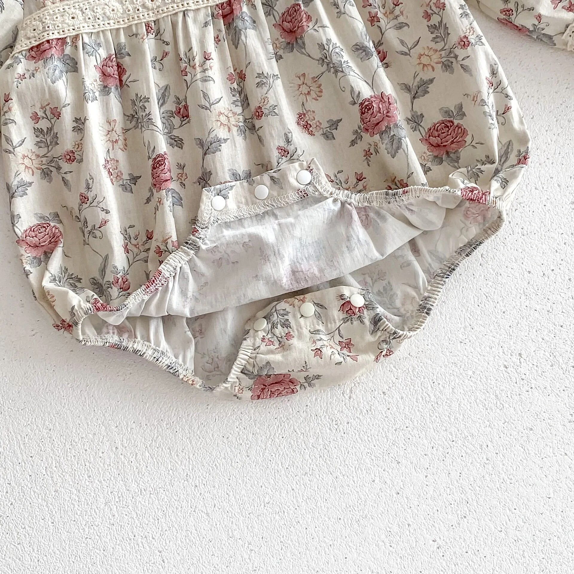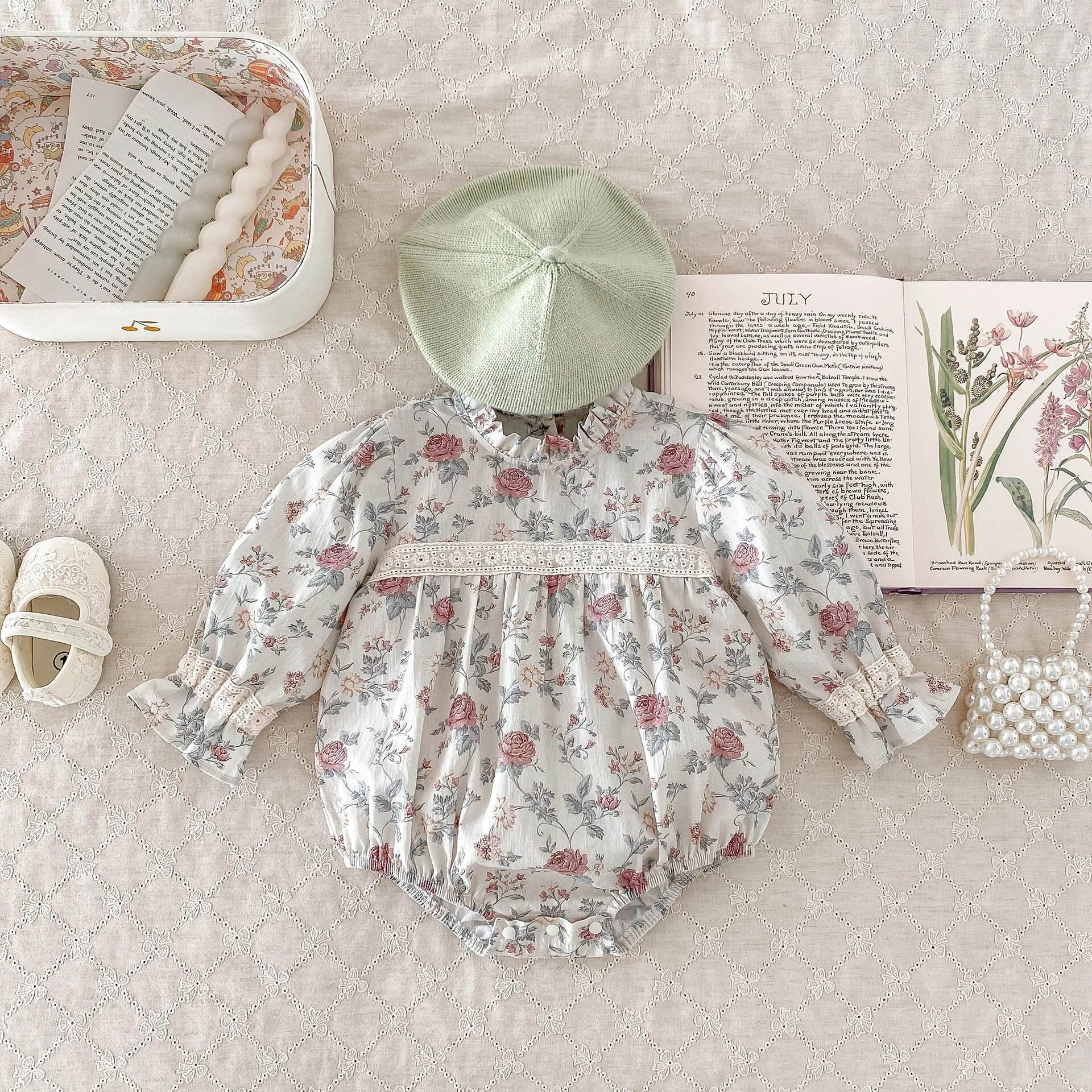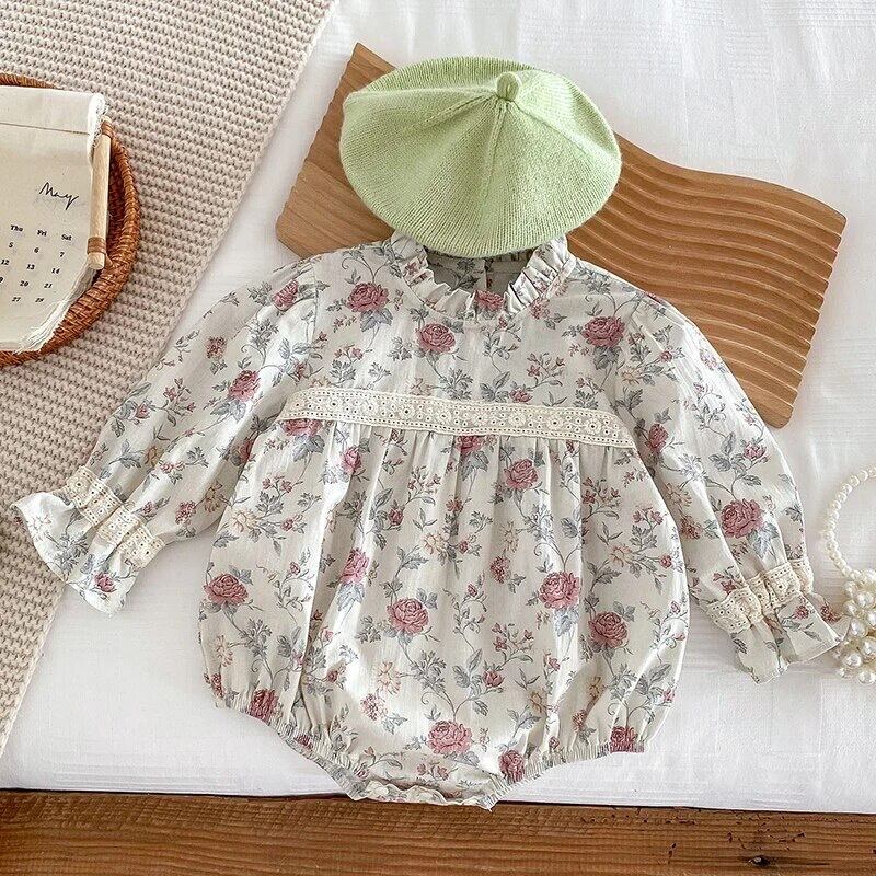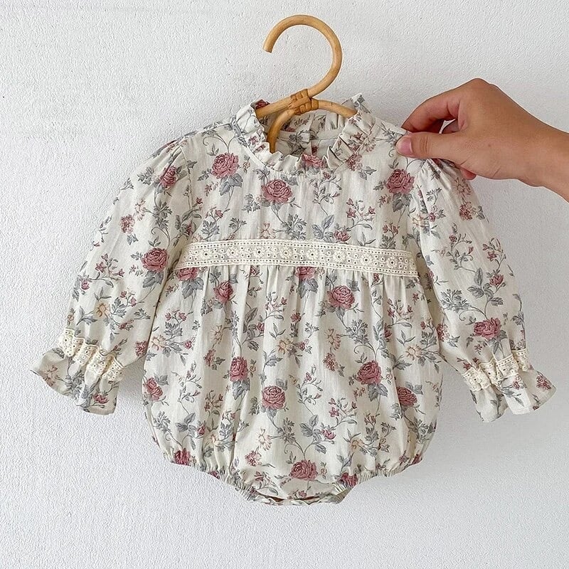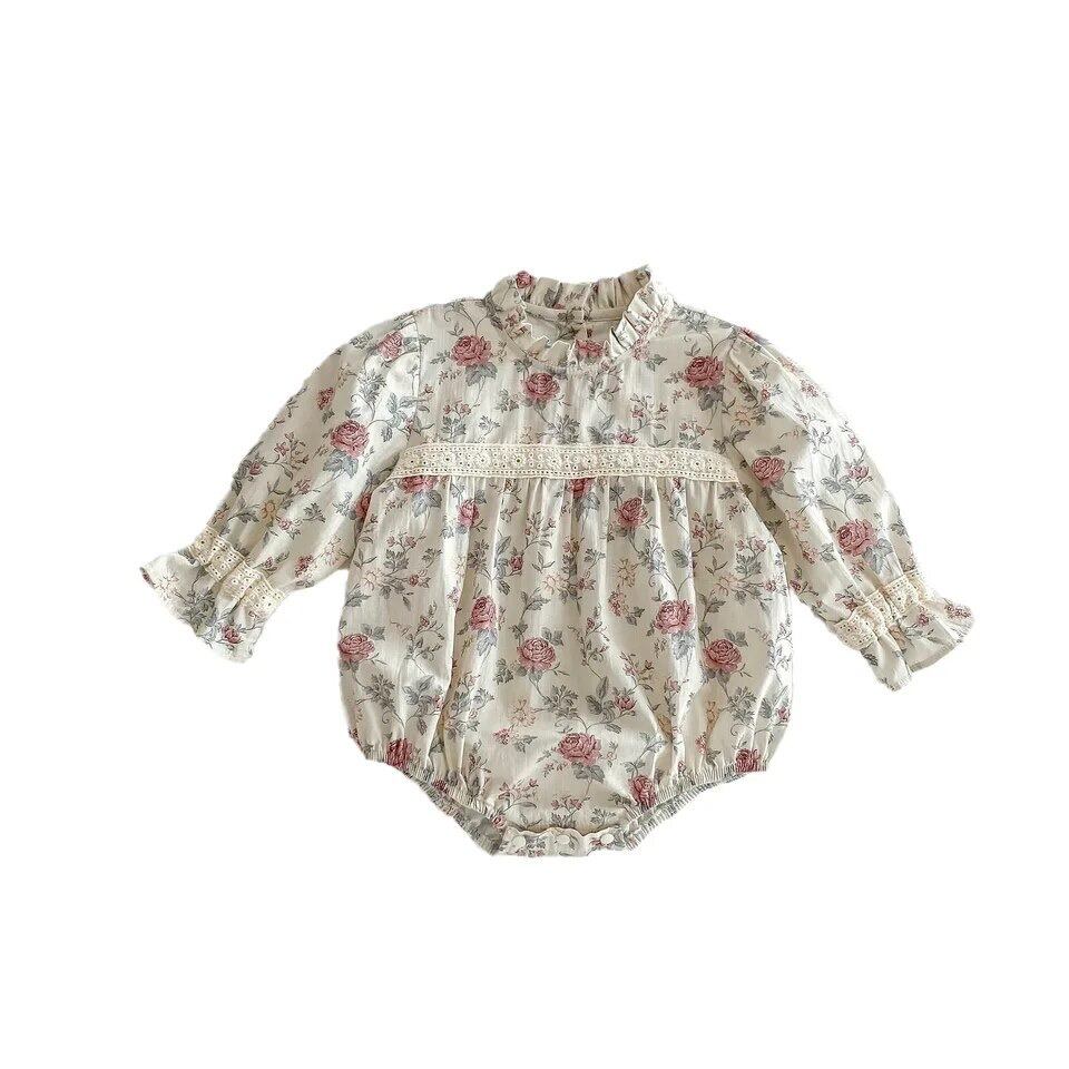 【取寄】お上品なフリルハイネックの花柄ロンパース