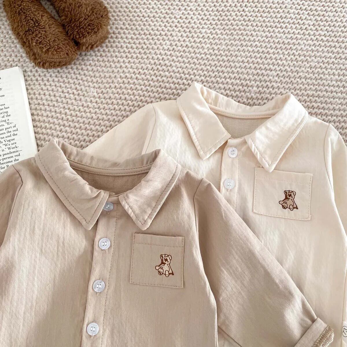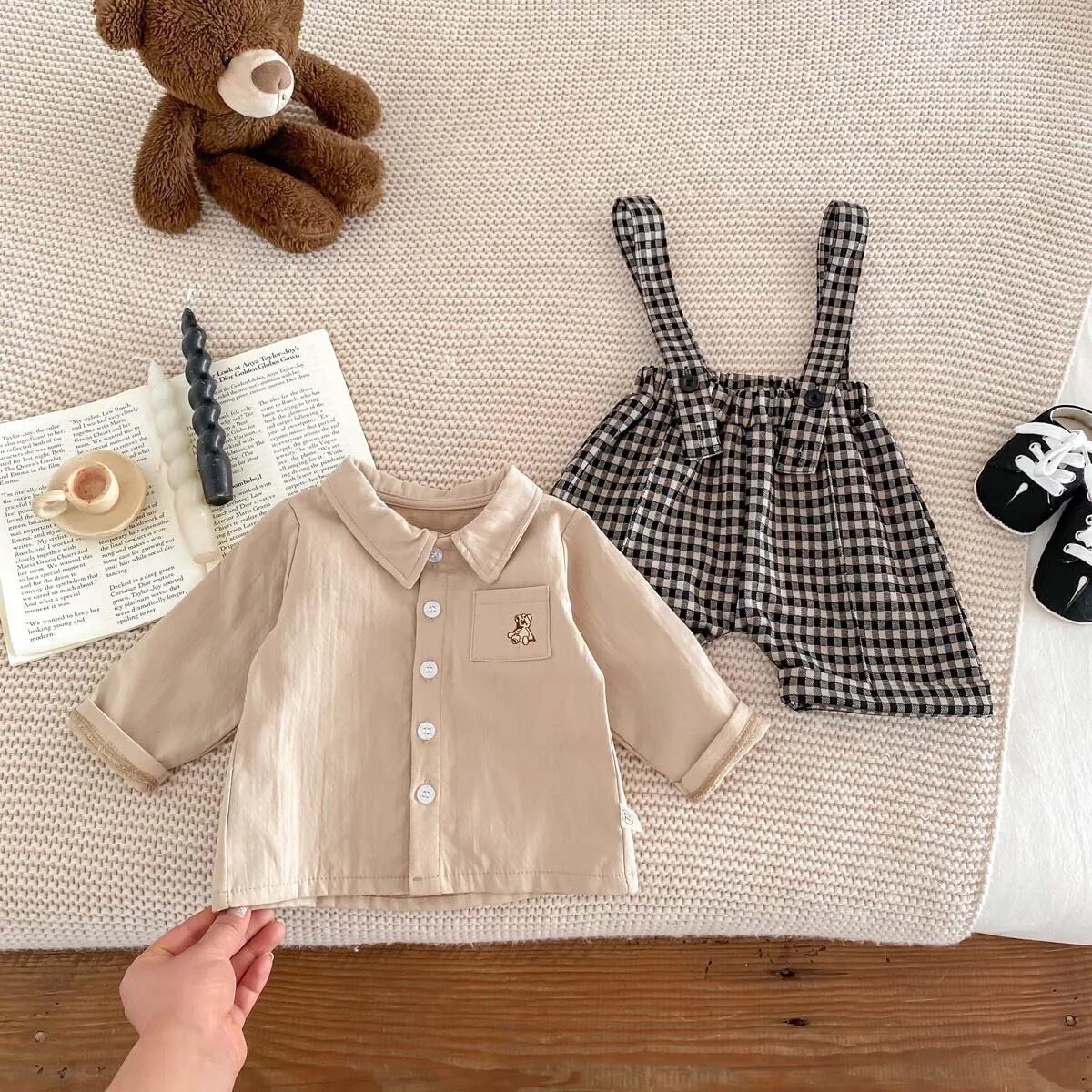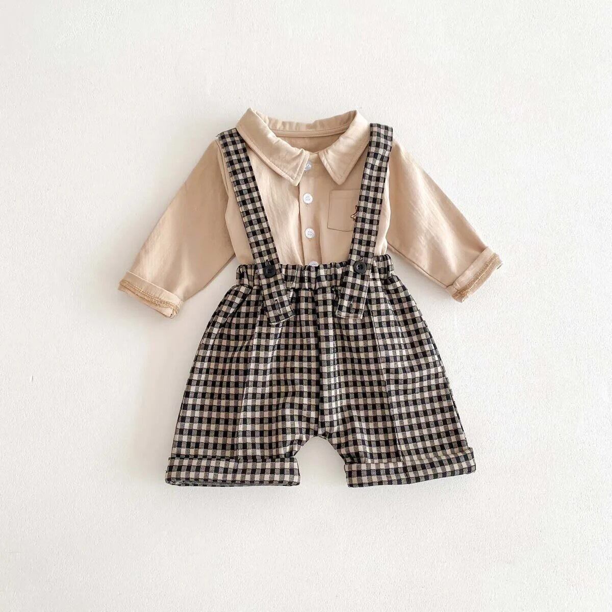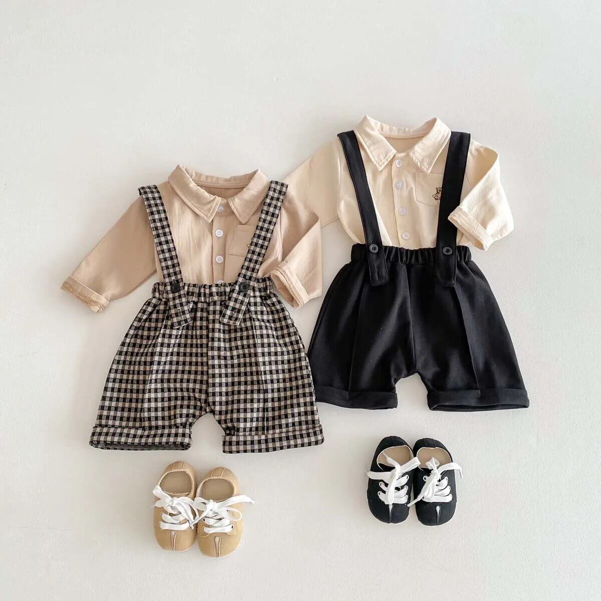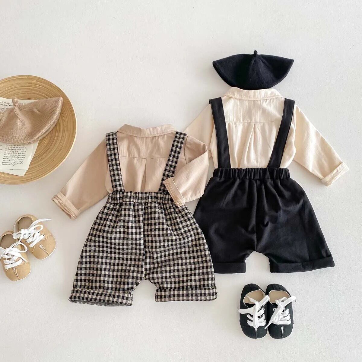 小さい子ならではのかわいさがあるサスペンダーパンツとワンポイント刺繍がかわいいシャツのセットです!